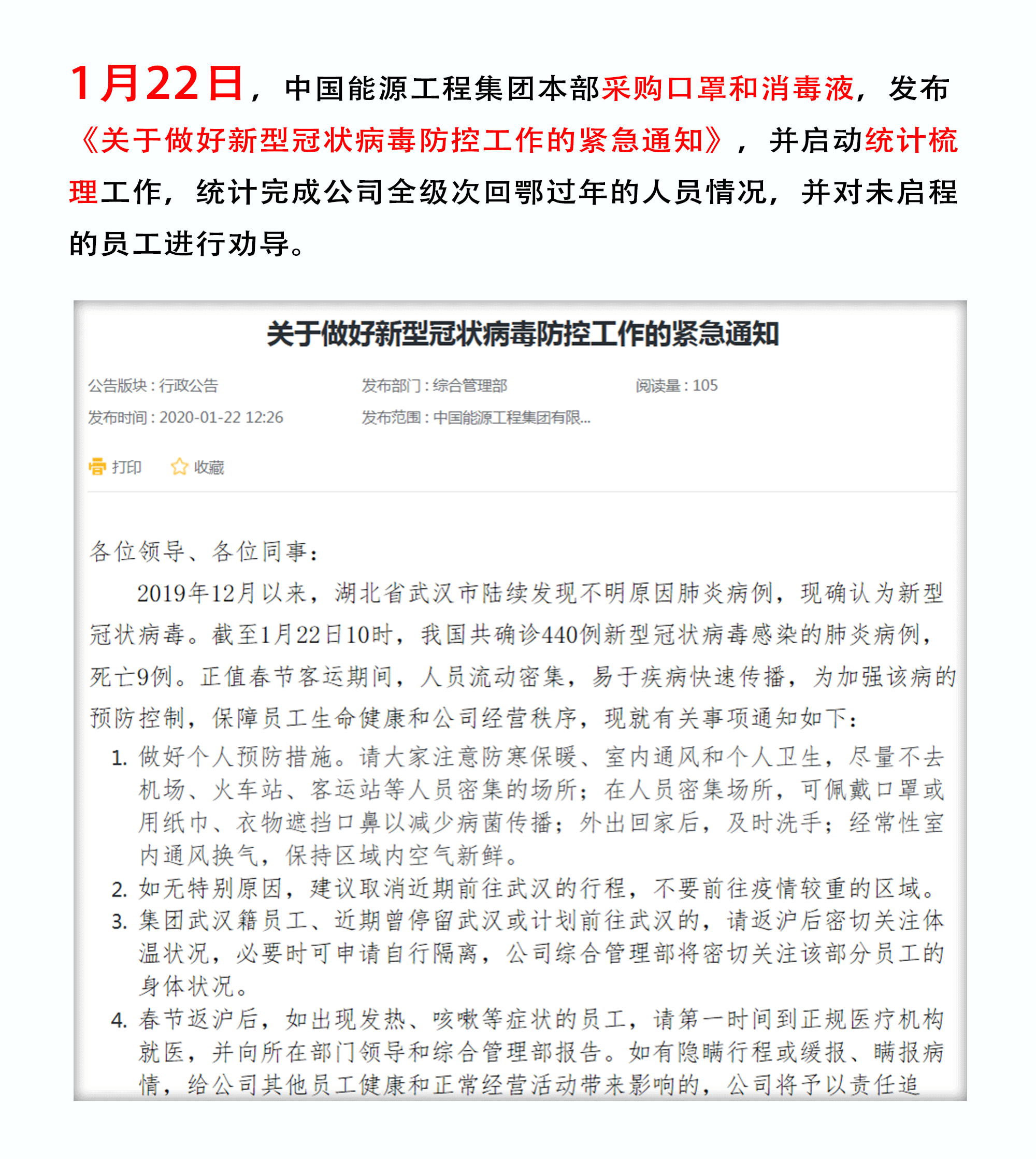 新型冠狀病毒感染的肺炎疫情持續(xù)肆虐,中國能源工程集團(tuán)認(rèn)真貫徹落實(shí)習(xí)近平總書記重要指示精神,按照國家和地方各級政府,國機(jī)集團(tuán)的安排部署,全局謀劃、迅速行動、系統(tǒng)推進(jìn)防疫工作。