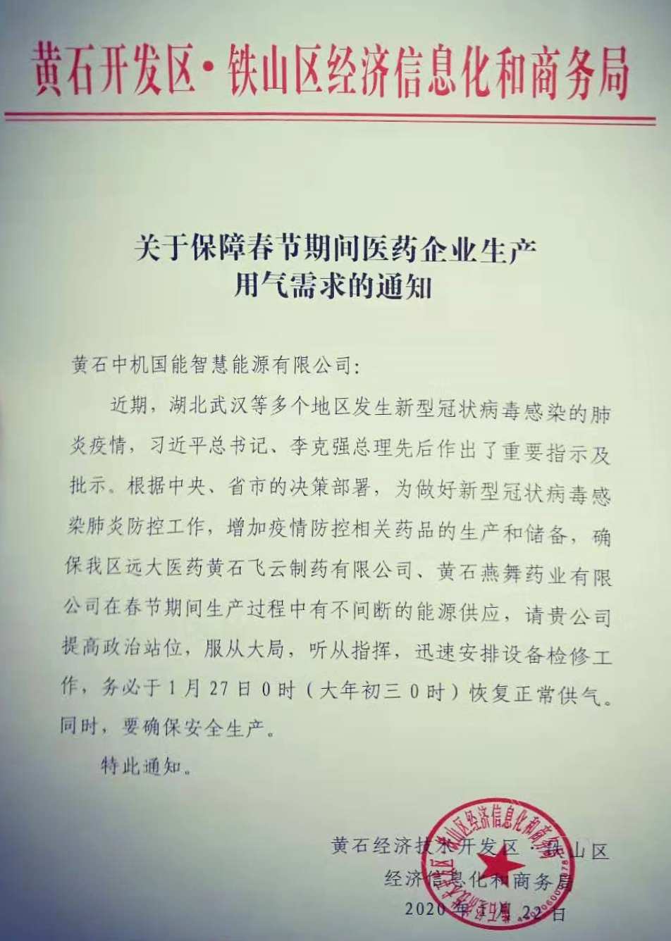 中國能源工程集團所屬中機國能電力集團有限公司負責運營的黃石項目承擔著為所在園區(qū)多家醫(yī)藥企業(yè)供應(yīng)蒸汽的工作。其中一家用氣企業(yè)遠大醫(yī)藥黃石飛云制藥公司是前線防疫用抗病毒顆粒的生產(chǎn)商。1月22日,接到政府指令,因春節(jié)期間該制藥公司需不間斷生產(chǎn),故其生產(chǎn)所需能源供應(yīng)同樣不能停。對此,黃石項目現(xiàn)場第一時間響應(yīng),服從大局,聽從指揮。
