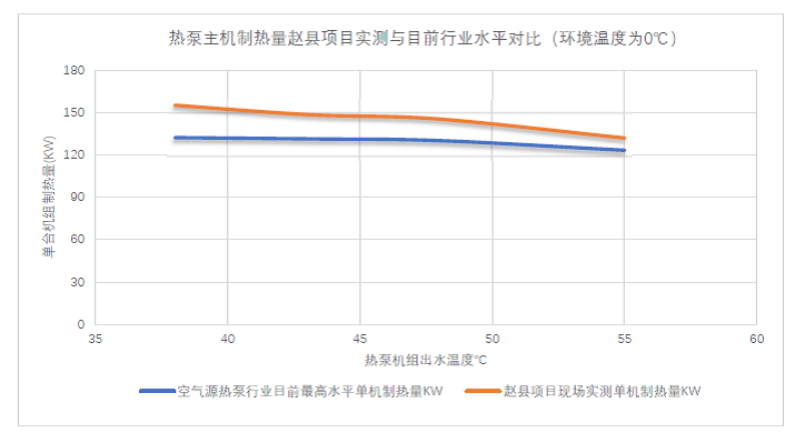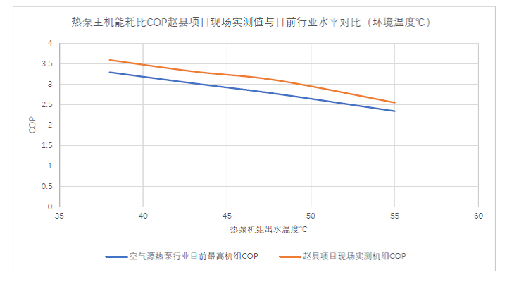 今年1月,項(xiàng)目業(yè)主方組織了包括投資方、運(yùn)營(yíng)方、建設(shè)方、監(jiān)理及設(shè)備供應(yīng)商等六方驗(yàn)收。此次驗(yàn)收從46個(gè)站點(diǎn)1200臺(tái)機(jī)組中隨機(jī)抽取3個(gè)站點(diǎn)的20臺(tái)設(shè)備進(jìn)行了2-3小時(shí)的連續(xù)測(cè)試和數(shù)據(jù)采樣,將測(cè)試結(jié)果與2019年7月的實(shí)驗(yàn)室測(cè)試數(shù)據(jù)作比對(duì)。現(xiàn)場(chǎng)性能測(cè)試過程中,即使在劣于實(shí)驗(yàn)室的環(huán)境中,受諸多不利因素影響,如機(jī)組輸入電壓波動(dòng)、水流量和水溫波動(dòng)、環(huán)境溫度和濕度變化等,機(jī)組取得的平均制熱量仍比供應(yīng)商承諾的考核值高11.6%,平均能耗比(COP)高6.4%,明顯優(yōu)于項(xiàng)目預(yù)測(cè)的技術(shù)經(jīng)濟(jì)指標(biāo)(詳見下圖)。