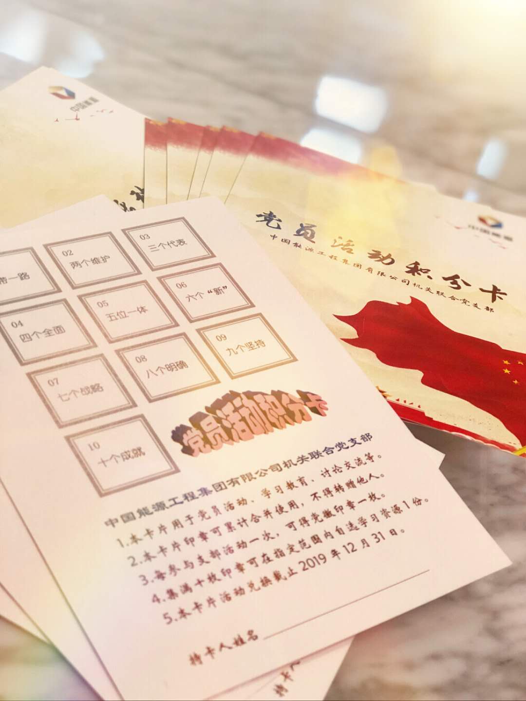 經(jīng)過一個多月的摸索,此次支部黨員大會上正式發(fā)布《黨員活動積分卡》。積分卡從“一”到“十”,羅列了十九大報告中的經(jīng)典名詞,將黨建知識與活動參與情況相結合,以集章兌換學習資源的方式,助力基層黨組織標準化建設,打造服務型、學習型黨支部。